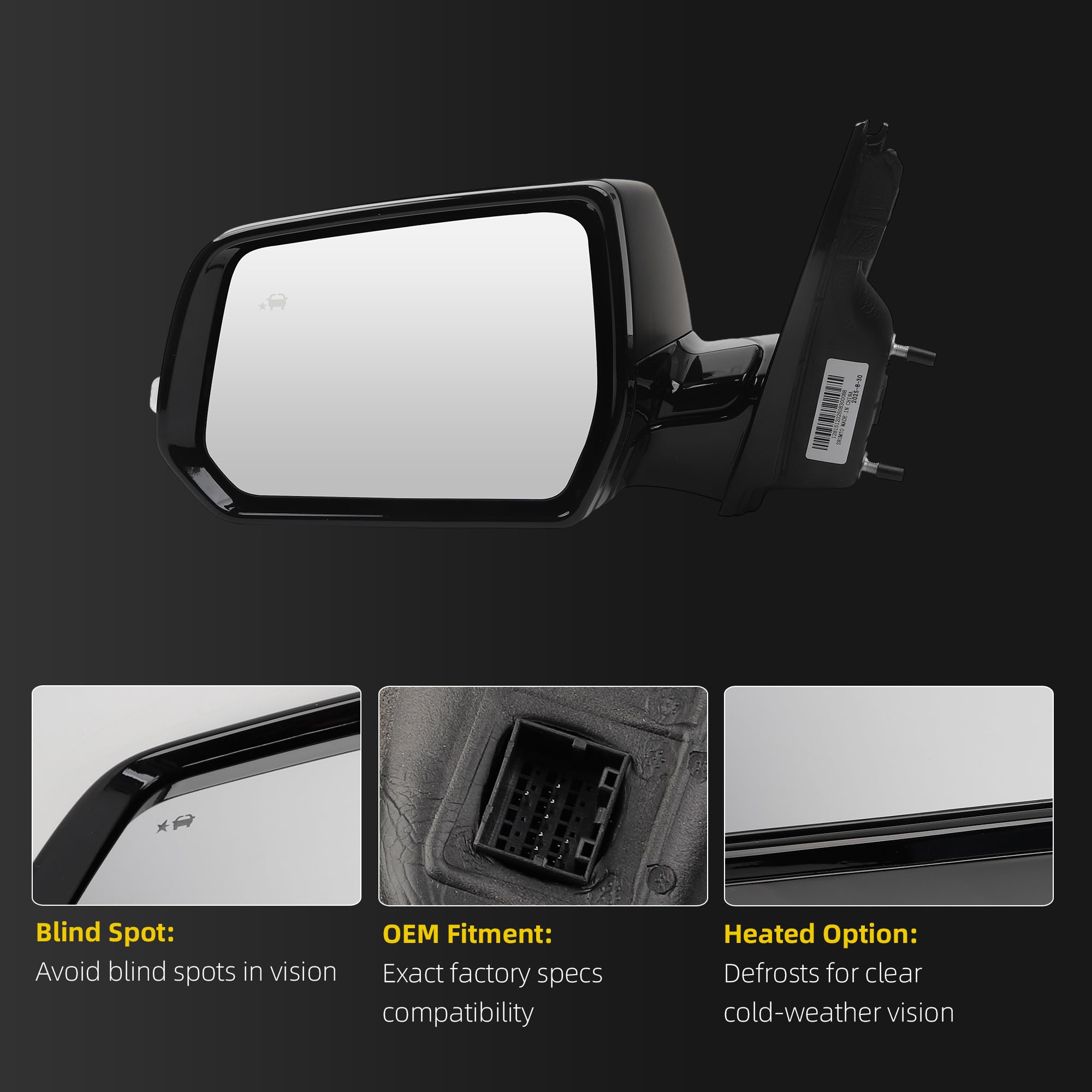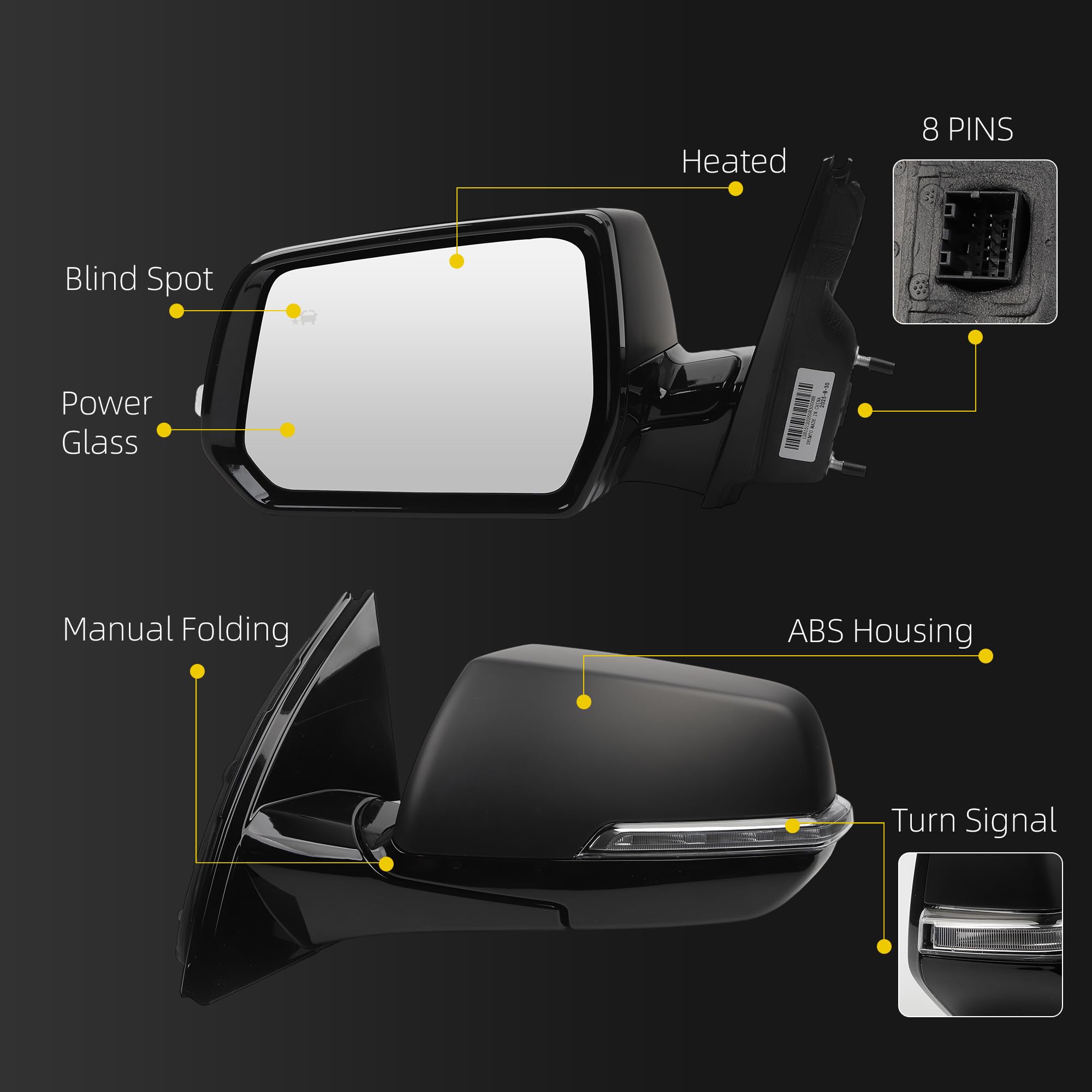 Features:The left mirror is equipped with power heated,high-quality glass,8pins,ABS housing,blind spot,plug and play,easy installation.