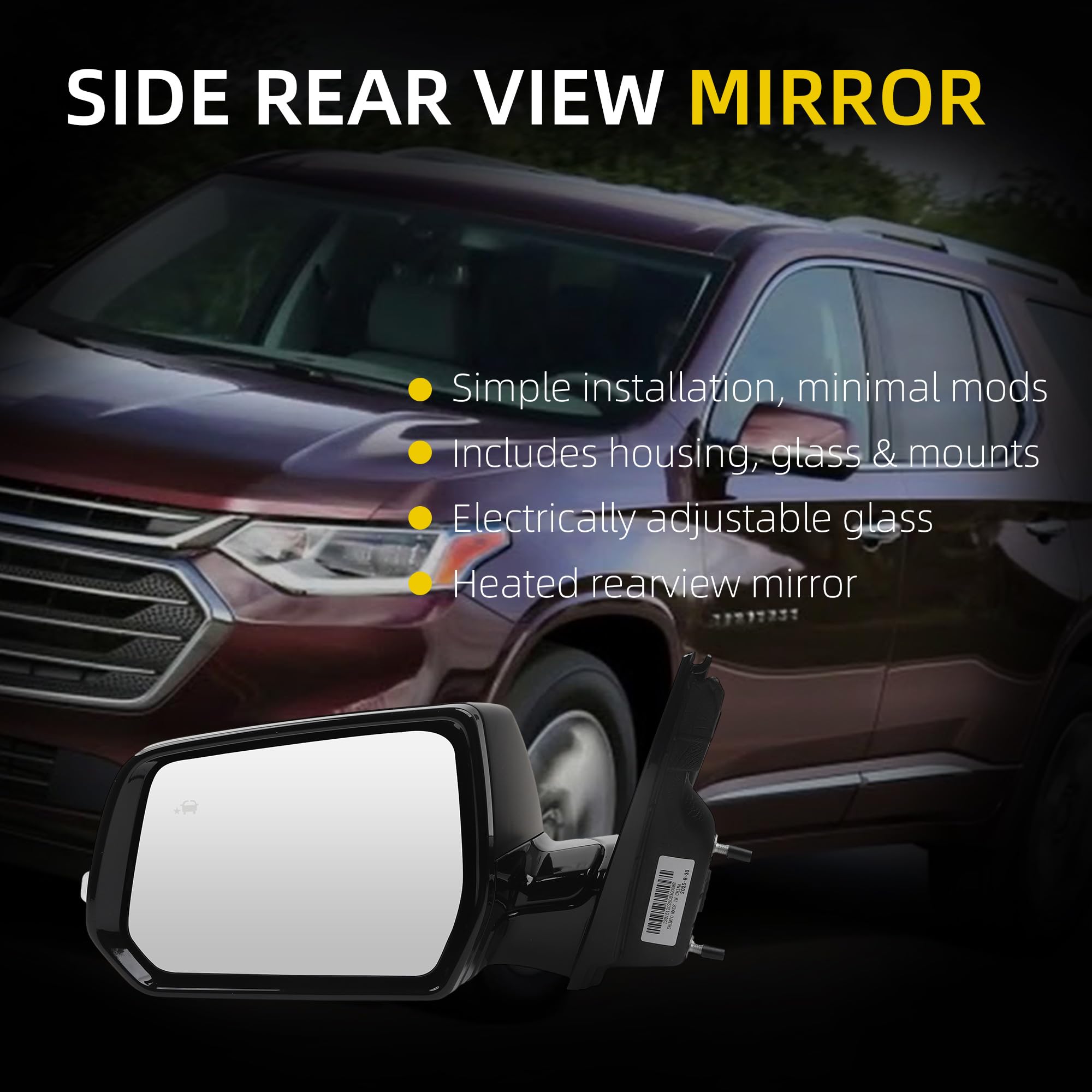 Fitment:The side rear view mirror compatible with 2018 2019 Chevrolet Traverse LT.
