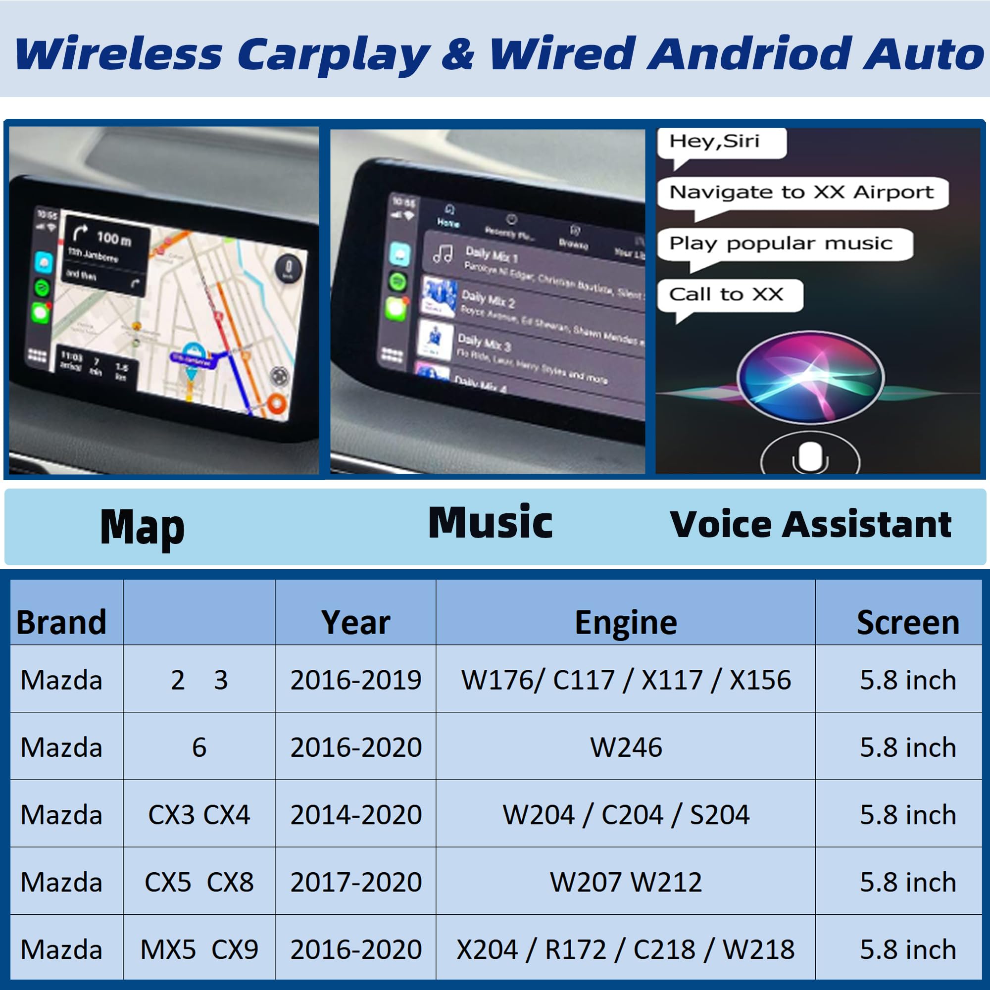 【NEWEST UPGRADED WIRELESS CARPLAY】Our New UPGRADED mazda carplay kit supports all functions of the original car system.It supports Support Voice Control and Hand-free Calling, Original Mazda SD Card Navigation map,Original Car Knob Control,Steering Wheel Operation,Camera & Parking Sensors and more original function.