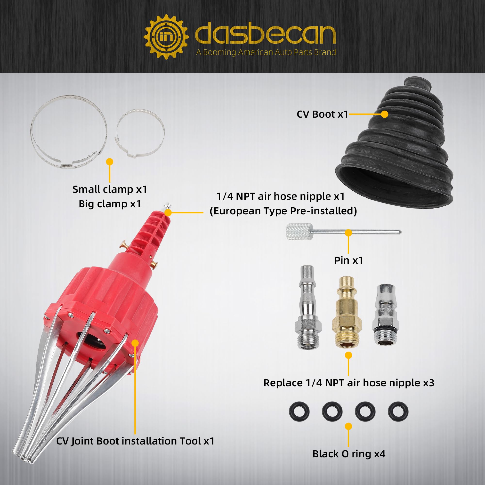 KIT Includes: The CV Joint Boot Tool Kit includes 1 x CV joint boot installation tool, 1 x rear CV axle boot kit,2 x PCS CV Joint Boot Clamp, 2 x 1/4" NPT air hose nipple, 1 x pin, 4 x black O ring.